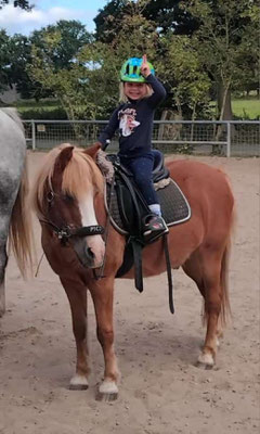 Links könnt ihr Paulchen sehen, Yuma reitet ihn jetzt dreimal pro Woche. Bis jetzt zeigt er sich sehr artig und ist immer motiviert.