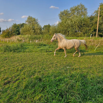 Wir freuen uns, dass wir jetzt eine isabellfarbendes Pony haben.